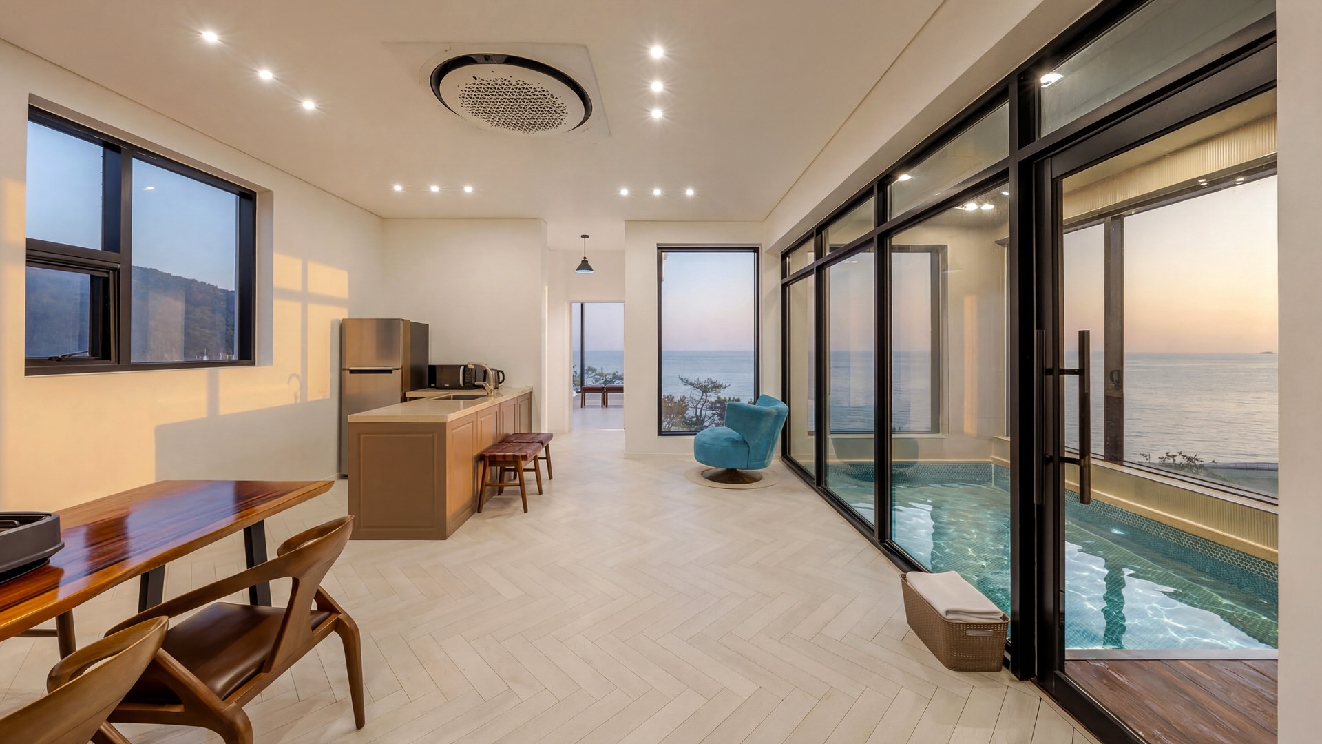 : 욕실용품, 남녀공용, TV, 금연, 냉장고, 에어컨, 전기밥솥, 취사시설/도구, OTT, 인덕션, 전자레인지, 샴푸, 치약, 바디워시, 드라이기, 린스, 풀빌라, 식탁, 바다전망